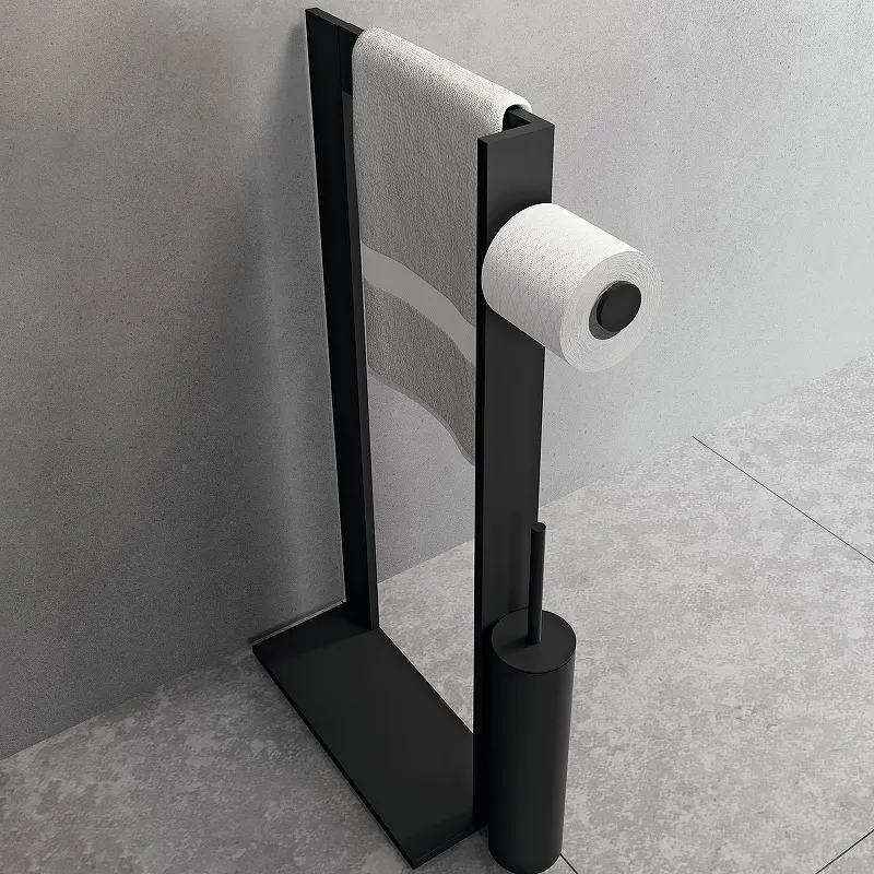 Напольная стойка Novellini Kuadra R90AKFPSRS-H.Характеристики: Цвет: черный матовый. Материал: алюминий. С держателем для полотенец. Оснащение: держатель туалетной бумаги, ёршик для унитаза, колба для ёршика. В комплекте поставки: Напольная стойка.