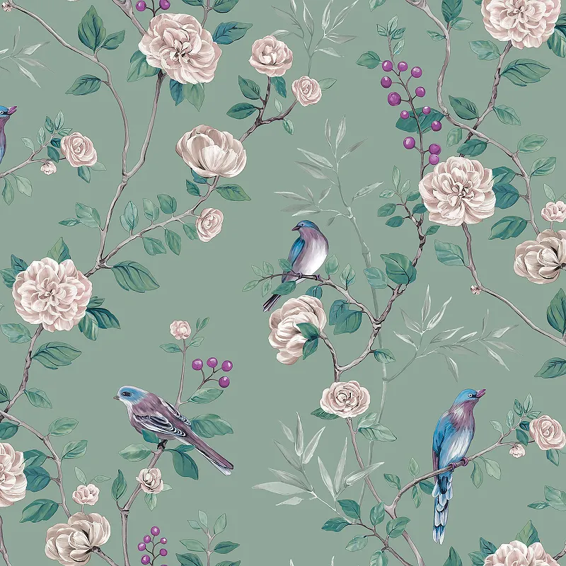 - Виниловые обои на флизелине (1,06*10,05) Зеленый, Птицы/Цветы