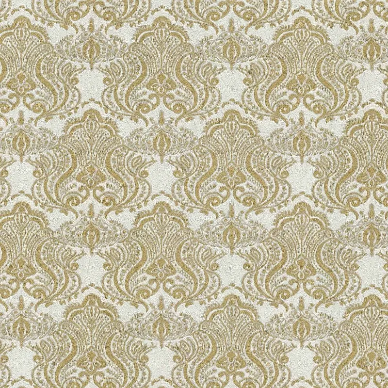 - Дамасский узор белый/золото добавляет изысканность и утонченность в интерьер, создавая атмосферу роскоши.