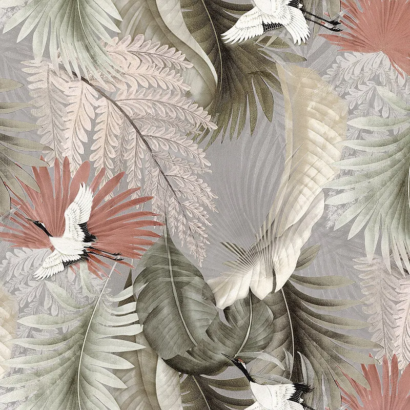 Обои Prima Italiana Volare 80474 Винил на флизелине (1,06*10) Серый/Зеленый/Розовый, Птицы/Листья