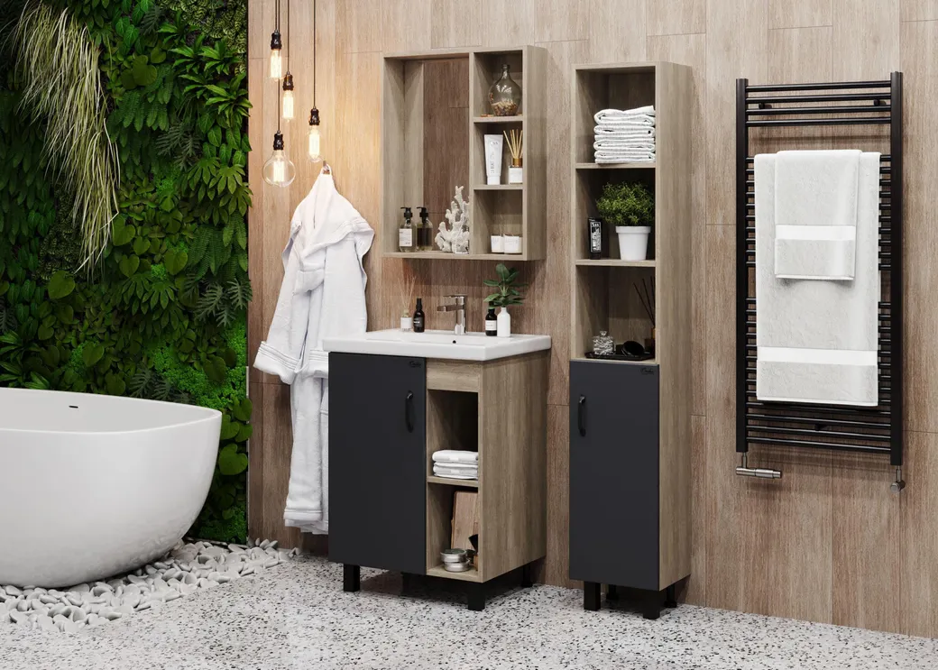 В пенале Onika ТИМБЕР 60.01 удачно сочетаются контрастные цвета и фактуры: серый матовый фасад с покрытием SoftTouch, корпус цвета дуба с роскошной текстурой, черная матовая металлическая фурнитура. Открытые полки сверху обеспечивают быстрый доступ к часто используемым аксессуарам, а пространство за распашной дверцей снизу, снабженной системой плавного закрывания, станет удобным местом для хранения различных бытовых принадлежностей. Корпус пенала выполнен из ЛДСП, фасад - из МДФ в пленке, устойчивых к механическим воздействиям, перепадам температур и высокой влажности. Черная металлическая ручка и 4 ножки (2 декоративных черных и 2 пластиковых) идут в комплекте с пеналом.