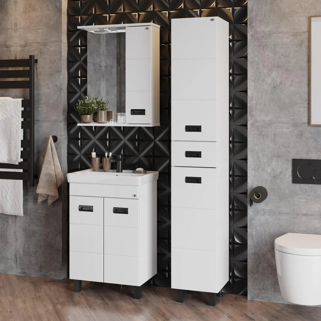 Пенал Onika БАЛТИКА 32.10 У - это простые функциональные формы и яркий акцент в любом дизайне. Глянцевый белый цвет фасада контрастирует с черной матовой фурнитурой, а ненавязчивая горизонтальная фрезеровка дополняет образ стильной и современной мебели. Удобный ящик с направляющими полного выдвижения посередине пенала и два больших отделения, разделенные горизонтальными полочками, за распашными дверями с механизмом плавного закрывания - отличное место для хранения необходимых вещей. Пенал имеет универсальную ориентацию: при установке верх и низ пенала можно менять местами, а дверцы могут открываться как влево, так и вправо. Корпус пенала выполнен из ЛДСП, фасад - из МДФ в пленке, устойчивых к механическим воздействиям, перепадам температур и высокой влажности. 2 декоративных и 2 пластиковых ножки с регулировкой по высоте идут в комплекте с пеналом.