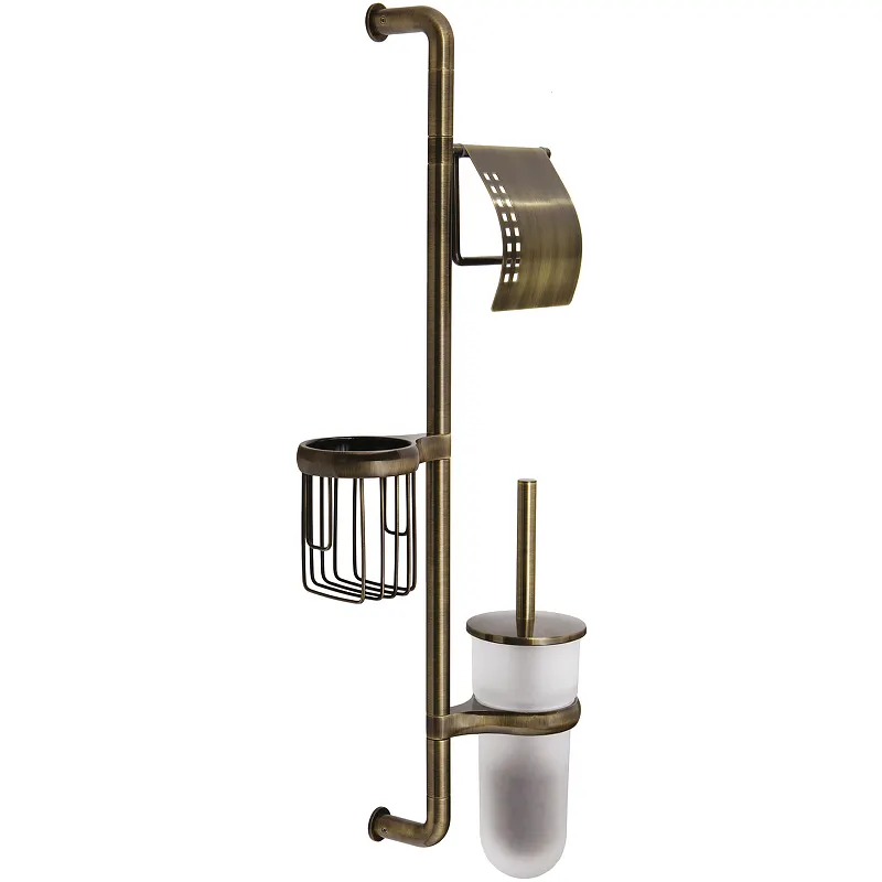 Подвесная стойка WasserKRAFT Exter K-1458 для ванной комнаты.Характеристики: Цвет: светлая бронза. Фактура: матовая. Материал: металл, матовое стекло. Уплотнительные пластиковые кольца. Монтаж: настенный. Габаритные размеры (ШхВхД): 27,6х69,3х9,5 мм. В комплекте поставки: Штанга. Держатель туалетной бумаги с крышкой. Держатель освежителя воздуха. Держатель стакана для ершика. Стакан для ершика. Ершик для унитаза. Набор для монтажа.
