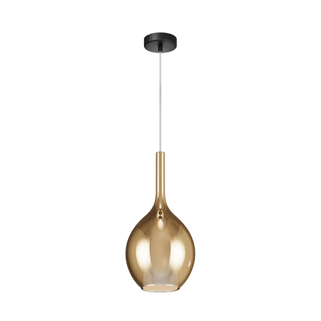 Металлическое основание, цвет — черный. Двойные стеклянные плафоны. Многообразные геометрические формы плафонов. Цвет стекла: зеркальный золотой, кофейный и дымчатый, а также градиентный белый. Регулируемая длина провода — 3 метра. Источник света — лампа с цоколем Е27.