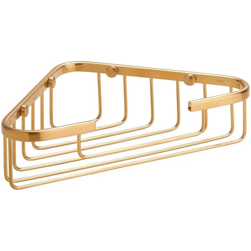 Полка корзина Bemeta Sablo 160208340 угловая идеально подходит для современного интерьера ванной комнаты. Этот настенный аксессуар с матовым золотым покрытием станет не только функциональным элементом, но и стильным акцентом. Изготовленная из прочной латуни, данная полка надежно выдерживает ежедневное использование.