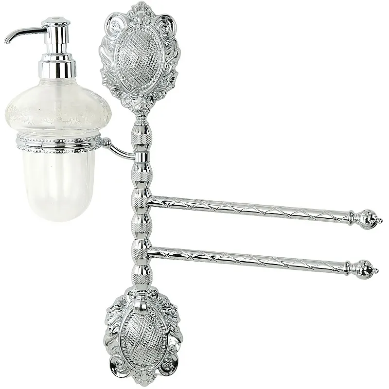 Полотенцедержатель с дозатором для жидкого мыла Migliore Cleopatra 16674 поворотный.Функциональный аксессуар для ванной комнаты.Характеристики: Цвет: хром. Материал: латунь, прозрачное стекло с матовым декором. Монтаж: на стену. Перекладины: поворотные 2 шт. В комплекте поставки: полотенцедержатель с дозатором для жидкого мыла.