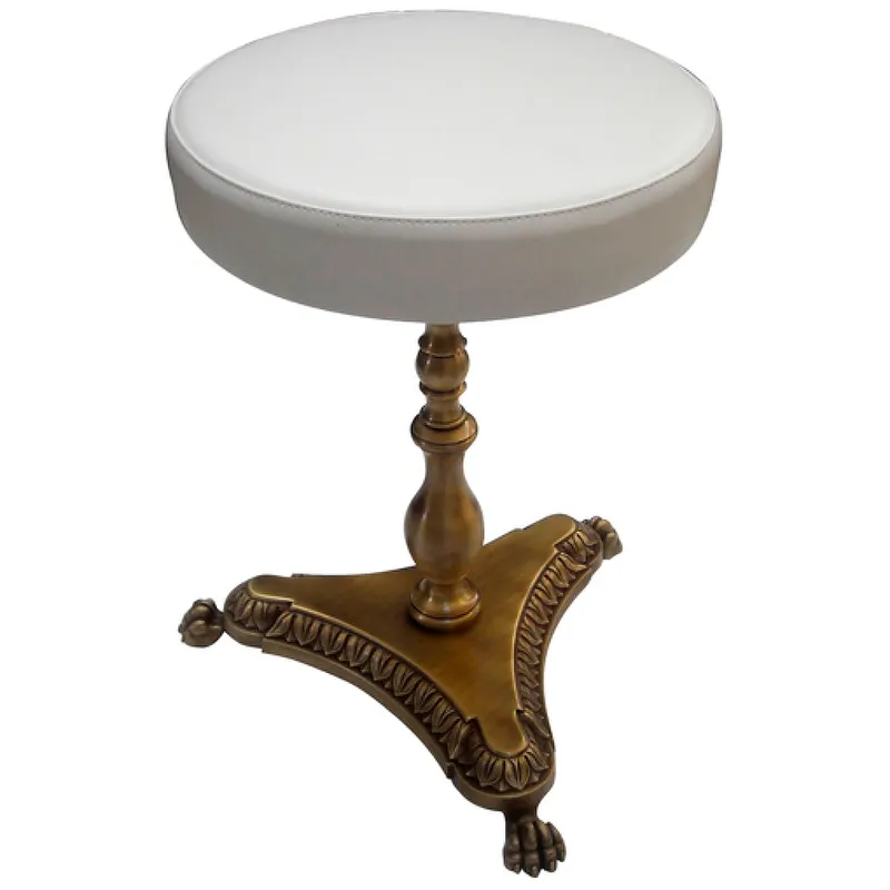 Пуф Migliore Elisabetta 17008 для ванной комнаты.Характеристики: Габаритные размеры (ШхВхГ): 415х505х415 мм. Основание: материал латунь, цвет бронза с патинированием. Сиденье: материал экокожа, цвет белый. Форма: круглая; на одной ножке. В комплекте поставки: Пуф.