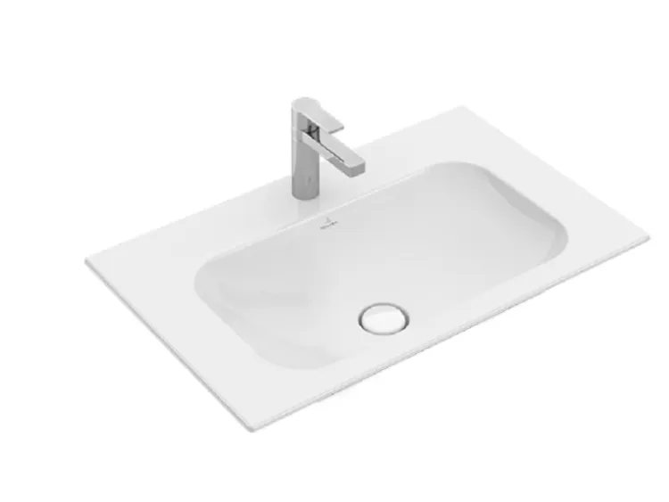 Раковина, Villeroy&Boch, Finion, ширина, мм-800, глубина, мм-500, высота, мм-100, тип установки-на тумбу, отверстия для смесителя-1 сквозное, 2 промаркированных, материал-TitanCeram, вид грязеотталкивающего покрытия-CeramicPlus, цвет-альпийский белый, с незапираемым клапаном, клапан с керамической крышкой арт-416481R1