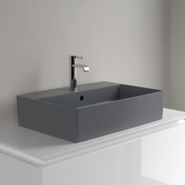 Раковина, Villeroy&Boch, Memento 2.0, ширина, мм-600, глубина, мм-420, высота, мм-90, тип установки-накладной (настольный), отверстия для смесителя-1, с переливом, материал-TitanCeram, вид грязеотталкивающего покрытия-CeramicPlus, цвет-Graphite арт-4A0760i4