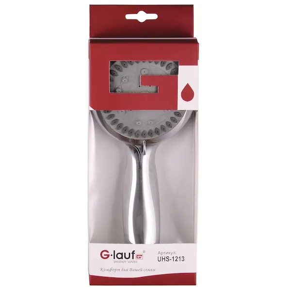 Ручной душ G-Lauf UHS-1213 превосходно впишется в любые интерьеры ванных комнат. Лейка выполнена из сертифицированных и качественных материалов. Хромированное покрытие гарантирует длительную износостойкость без царапин.