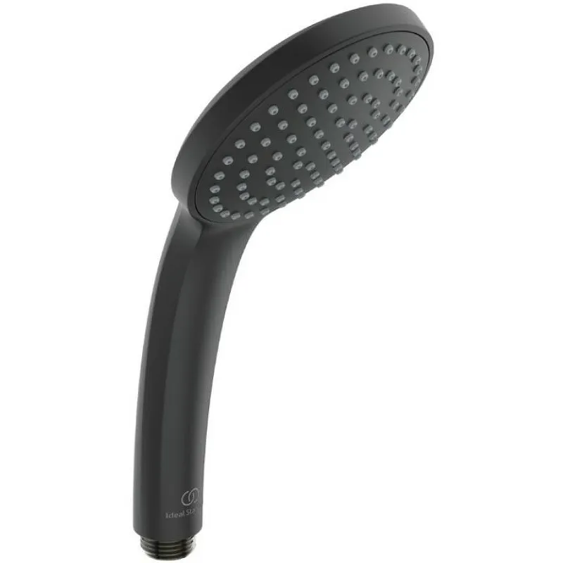Ручной душ Ideal Standard Ideal Rain B9402XG.Характеристики: Материал: пластик. Цвет: черный шелк. Форма лейки: круглая. Диаметр рабочей части: 10 см. Легкоочищаемая (резиновые форсунки). Ограничение потока 8 л/мин. В комплекте поставки: лейка