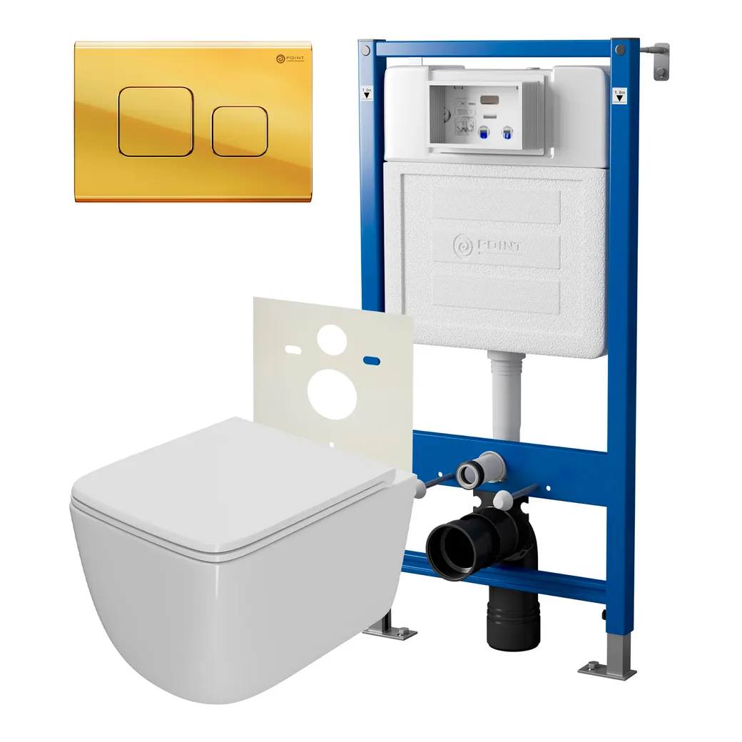 Сет: Система инсталляции Point Элемент для подвесного унитаза PN45120 + Клавиша смыва для инсталляции Point Афина, золото, PN44041G + Унитаз подвесной Point Меркурий безободковый, сиденье дюропласт микролифт, быстросъем, белый PN41831