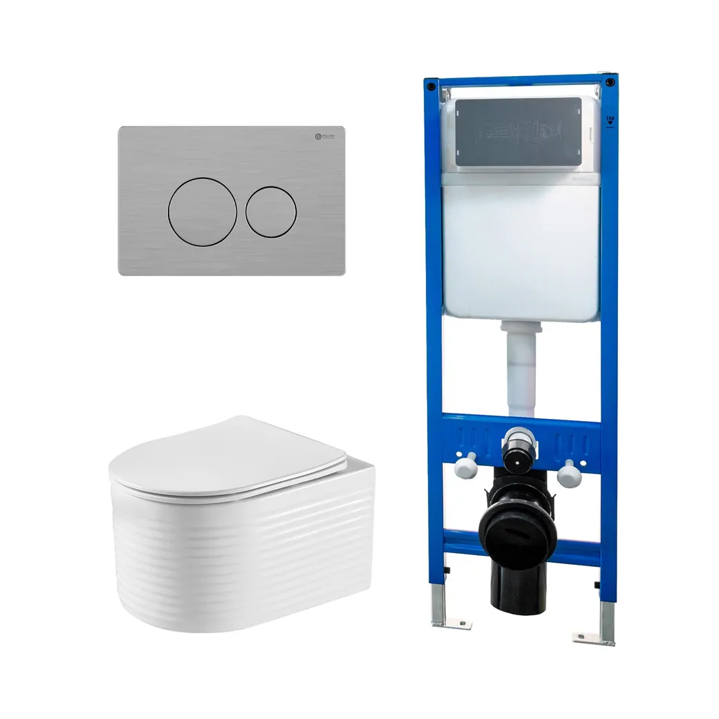 Сет: Система инсталляции Point Элемент для подвесного унитаза PN45124 + Клавиша смыва для инсталляции Point Виктория, нержавеющая сталь, сталь брашированная, PN44061SB + Унитаз подвесной Point Омега безободковый, белый, сиденье дюропласт, микролифт быстросъемное PN41902