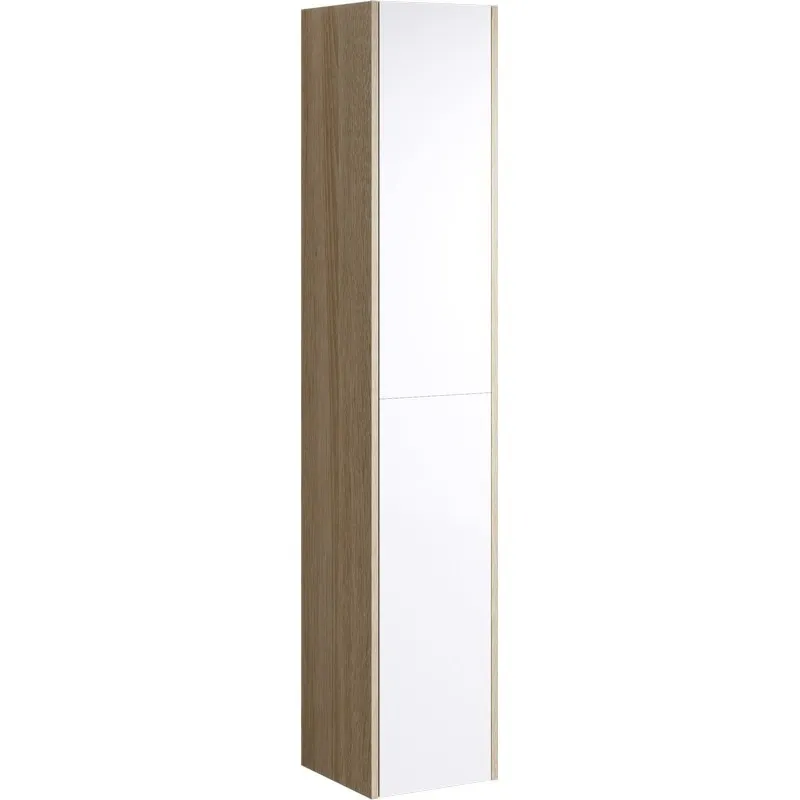 - Минималистичный дизайн: Данный шкаф пенал идеально вписывается в современный интерьер, сочетая белую глянцевую поверхность и древесный узор.