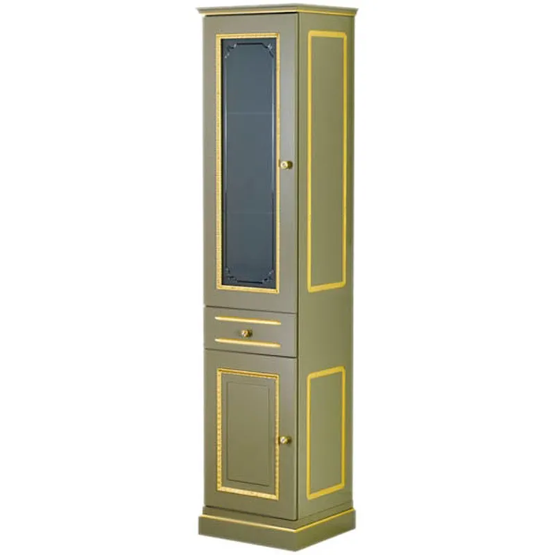 - Эстетичность и стиль: Оливковый шкаф пенал с декором цвета золота идеально впишется в классический интерьер ванной комнаты.
