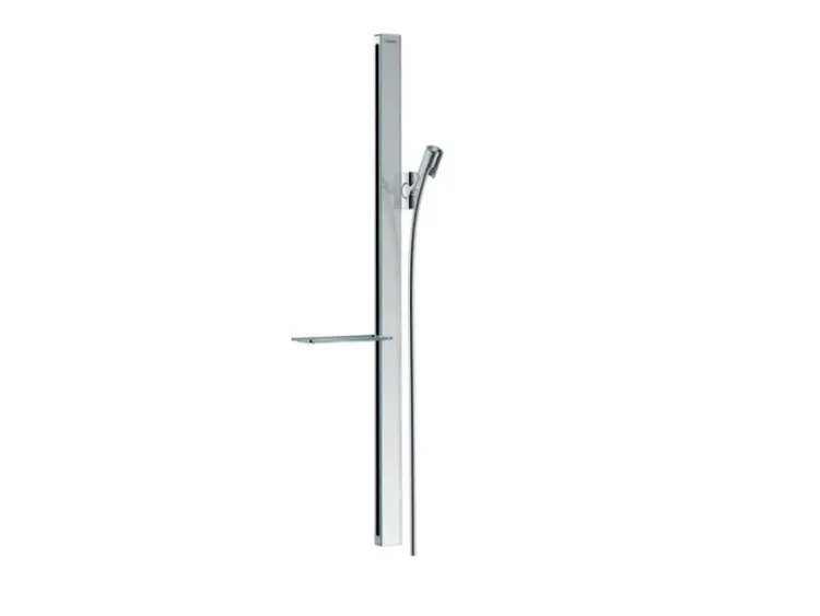 Штанга для душа, Hansgrohe, Unica'E, длина штанги, мм-900, держатель ручного душа-есть, шланг-есть, длина шланга, мм-1600, мыльница-есть, цвет-хром, держатель ручного душа регулируется в пределах 90°, поворачивается вправо и влево, перемещается вверх и вниз, самоблокирующийся, регулировка-плавная, материал полки-безопасное стекло, ширина штанги,мм-41, монтаж-настенный арт-27640000