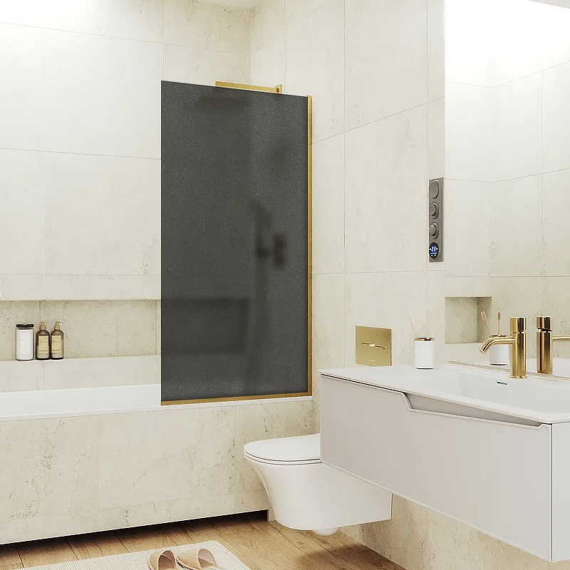 Шторка на ванну Maybah Glass MGV-85-3у 500x1400 в узком профиле.Характеристики: Цвет профиля: золото. Материал профиля: анодированный алюминий. Вид профиля: узкий. Исполнение полотна шторки: графитовое матовое закаленное стекло, толщиной 8 мм. Размеры (ШхВ): 500х1400 мм. Конструкция шторки: неподвижная. Ориентация: универсальная. Монтаж: пристенный, на борт ванны. В комплекте поставки: Закаленное стекло, цвет Графит матовый, толщина 8 мм 1400х500 мм - 1 шт. Профиль П-образный, цвет Золото - 2 шт. Комплект крепежа - 1 шт. Герметик силиконовый санитарный, бесцветный - 1 шт. Инструкция по монтажу - 1 шт.