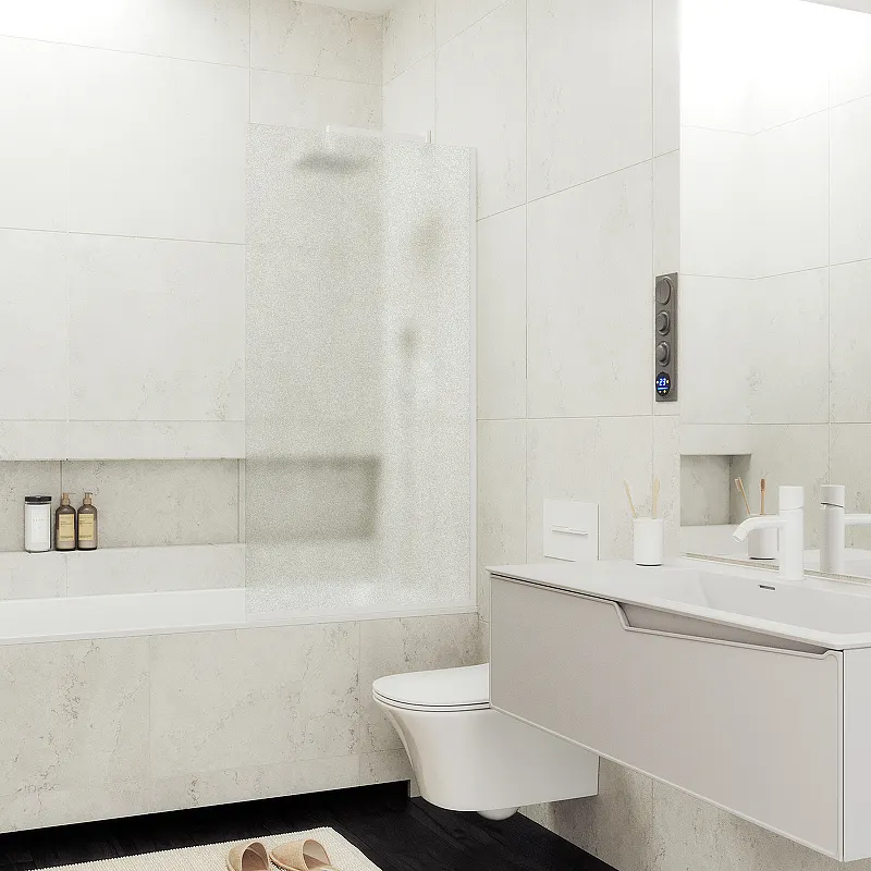 Шторка на ванну Maybah Glass MGV-94-1у 800x1400 в узком профиле.Характеристики: Цвет профиля: белый. Материал профиля: анодированный алюминий. Вид профиля: узкий. Исполнение полотна шторки: сатиновое закаленное стекло, толщиной 8 мм. Размеры (ШхВ): 800х1400 мм. Конструкция шторки: неподвижная. Ориентация: универсальная. Монтаж: пристенный, на борт ванны. В комплекте поставки: Закаленное стекло, цвет Сатин, толщина 8 мм 1400х800 мм - 1 шт. Профиль П-образный, цвет Белый - 2 шт. Комплект крепежа - 1 шт. Герметик силиконовый санитарный, бесцветный - 1 шт. Инструкция по монтажу - 1 шт.