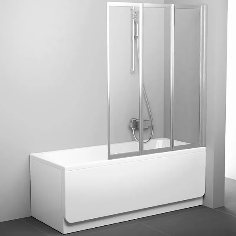 Шторка на ванну Ravak Behappy VS3 130 795V0U00Z1.Характеристики: Ориентация: универсальная. Цвет исполнения профиля: сатин. Материал профиля: алюминий. Витраж: безопасное стекло Transparent (прозрачное) толщиной 3 мм. Конструкция дверей: складная. Размер (ШхВ): 1300х1400 мм. В комплекте поставки: Шторка на ванну.