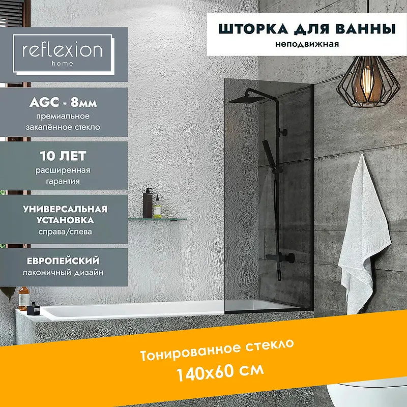 Шторка на ванну Reflection 60х140 RX14060TBL-05 — это идеальное решение для тех, кто ищет стильный и функциональный элемент для ванной комнаты. Данную шторку отличает современный дизайн и высокая прочность, благодаря использованию закаленного тонированного стекла. Устанавливается она пристенно на ванну, обеспечивая надежную защиту от брызг и создавая эстетичный вид.