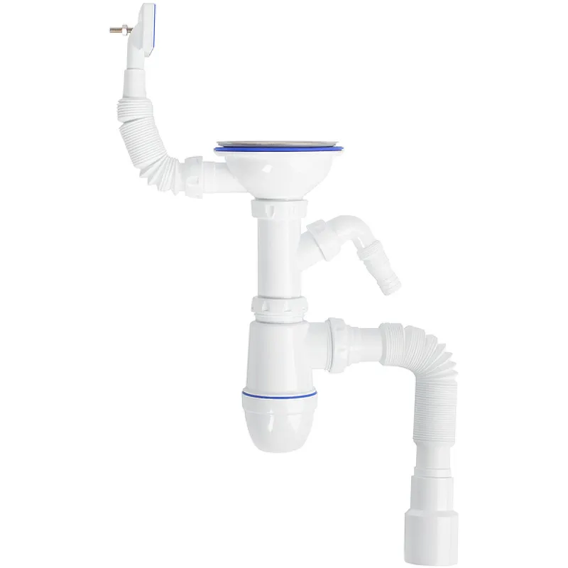 Сифон для кухонной мойки Iddis Kitchen Line S11UPS0i84.Характеристики: Цвет: белый. Материал: полипропилен. Выпуск: 3 1/2, диаметр 40 мм. Отдельный отвод для посудомоечной/стиральной машины. Сетчатый выпуск-чашка из нержавеющей стали диаметром 115 мм. Хромированный шток, винт, ручка из латуни. В комплекте поставки: Сифон.