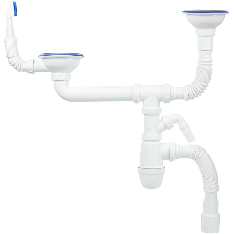 Сифон для двойной кухонной мойки Iddis Kitchen Line S21UPS0i84 с переливом и отводом.Характеристики: Цвет: белый. Материал: полипропилен. Выпуск: 3 1/2, диаметр 40 мм. Диаметр сливного отверстия: 90 мм. Отдельный отвод для стиральной машины. Сетчатые выпуски-чашки из нержавеющей стали диаметром 115. Хромированный шток, винт, ручка из латуни. В комплекте поставки: Сифон.