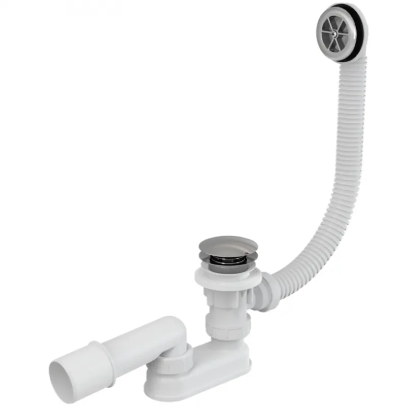 Click-Clack слив-перелив для ванны Alcaplast A505KM-80 изготавливается из высококачественных материалов.Слив-перелив система для ванны.Мокрый гидрозатвор с вращающимся коленом.Закрытие сливного клапана системой CLICK/CLACK.Гибкий шланг системы перелива.Длина сифона для ванны 80 см.Технические характеристики:Гидрозатвор: 50 mm.Сток воды: 48,6 l/min.Скорость перелива: 42 l/min.Сопротивление гидрозатвора против давления: 588 Pa.Термическая устойчивость: 95 градусов.В комплекте поставки:Корпус сифона с системой перелива.Хромированная пластиковая решетка перелива.Хромированная стальная пробка.Хромированный латунный донный клапан.Гидрозатвор сифона из полипропилена, сваренный ультразвуковым методом, устойчив к термическим и химическим воздействиям.Монтажный комплект.Профильное уплотнение.