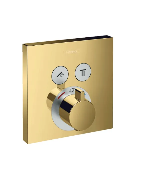 Смеситель для душа, Hansgrohe, ShowerSelect, тип открывания воды-нажимной (кнопки), тип регулирования воды-термостатический картридж, тип установки-встраиваемый, внутренняя часть-необходимо заказать, цвет-полированное золото, комплектация-ручка, накладка, гильза, блок смешивания, кнопки арт-15763990