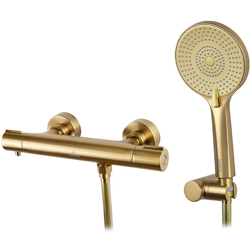 Смеситель для душа Kaiser Serio 05377-3 с термостатом и душевым гарнитуром.Характеристики: Цвет: шлифованное золото. Материал: латунь. Управление: термостат. Механизм: термостатический картридж. Стандарт подводки: G 1/2. Диаметр ручного душа: 120 мм. Количество режимов струи ручного душа: 3. Длина душевого шланга: 1500 мм. Монтаж: на стену. В комплекте поставки: . Смеситель для душа. Ручной душ. Душевой шланг. Держатель ручного душа. Отражатели. Эксцентрики.