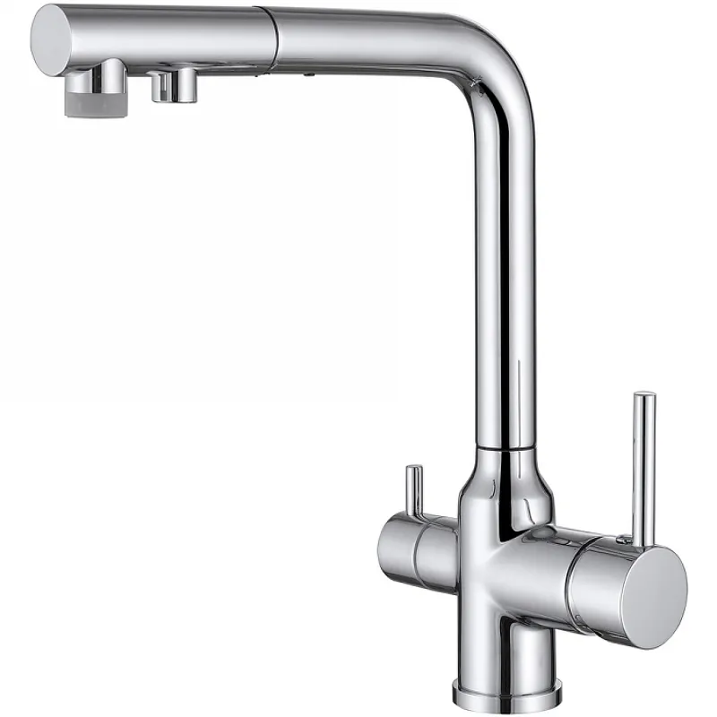 Смеситель для кухни Abber Emotion AF8814.Характеристики: Цвет: хром. Материал: латунь. Управление: однорычажное. Механизм: керамический картридж. Излив: поворотный, выдвижной с каналом для питьевой воды. Аэратор. Стандарт подводки: 1/2. Тип подводки: гибкая. Отверстий для монтажа: 1. Монтаж: на мойку / на столешницу. В комплекте поставки: Смеситель для кухни. Гибкая подводка. Крепления.