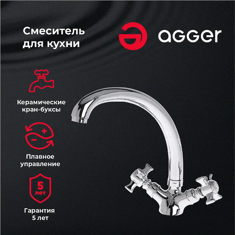 Смеситель для кухни Agger Retro-X A1700200 – двухзахватный с аэратором, для отсутствия разбрызгивания воды. Выполнен в стиле ретро. Корпус смесителя изготовлен из качественного латунного сплава и оснащен двумя керамическими кран-буксами, которые позволяют контролировать напор воды и регулируют температуру. Средний поворотный излив дает возможность универсального использования смесителем во время мытья посуды. Основные характеристики:Цвет: хром глянцевый.Материал: латунь.Управление: двухвентильный.Механизм: керамическая кран-букса.Тип подводки: гибкая G 1/2.В комплекте поставки: Смеситель; Гибкая подводка; Набор креплений; Инструкция.