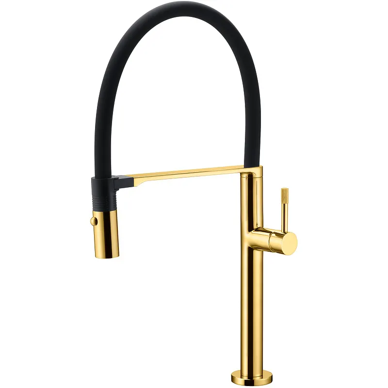 Смеситель для кухни Boheme Uno 114-G.Характеристики: Цвет: золото. Материал: латунь. Управление: однорычажное. Механизм: керамический картридж. Излив: поворотный, гибкий. Стандарт подводки: G 1/2. Тип подводки: гибкая. Аэратор. Монтаж: на мойку/на столешницу. В комплекте поставки: Смеситель для кухни. Гибкая подводка. Аэратор. Крепежный комплект.