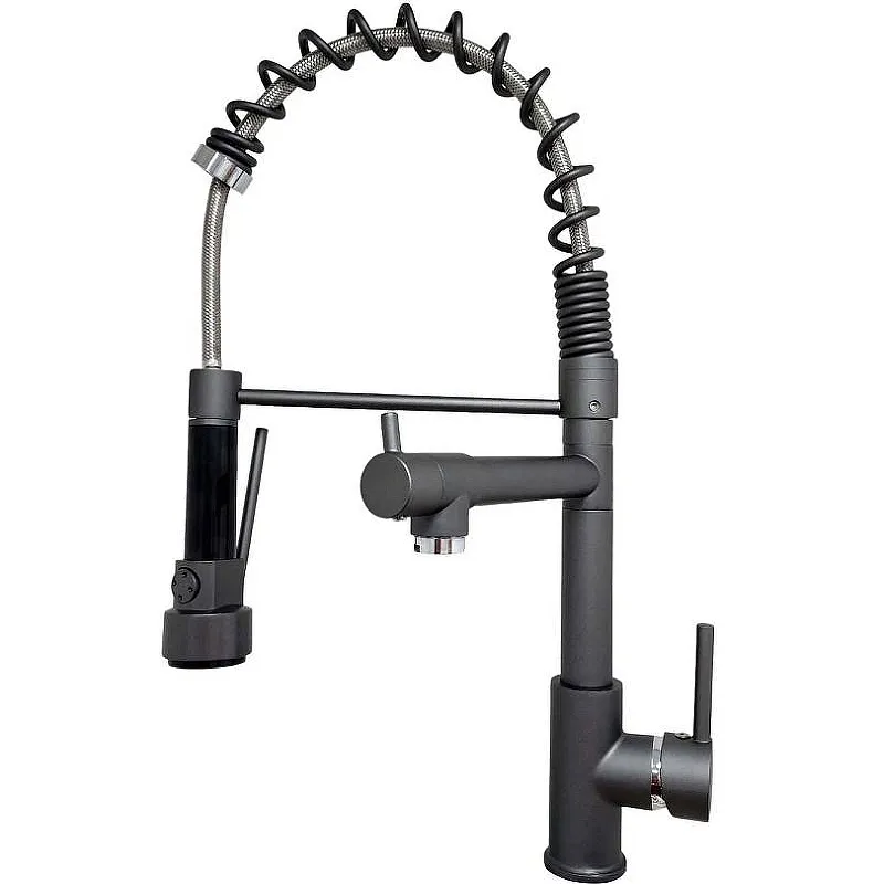 Смеситель для кухни BRNOU BR-704.Характеристики: Цвет: антрацит. Материал: латунь. Управление: рычажное. Механизм: керамический картридж 40 мм. Основной излив: поворотный. Дополнительный излив: поворотный, гибкий, с режимом душ. Аэратор. Стандарт подводки: G 1/2. Тип подводки: гибкая. Монтаж: на мойку, на столешницу. В комплекте поставки: Смеситель. Гибкая подводка.