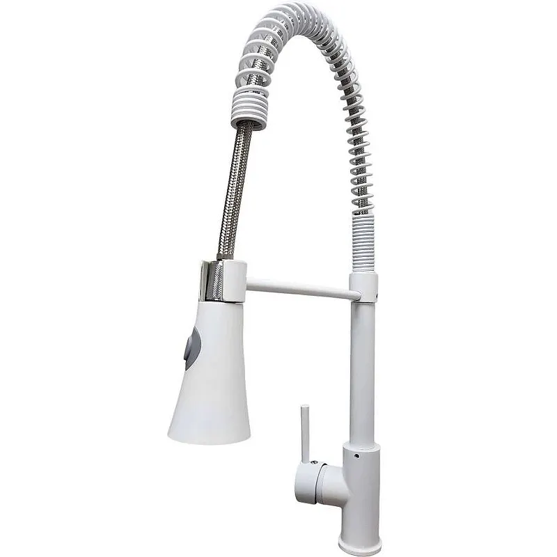 Смеситель для кухни BRNOU BR-821.Характеристики: Цвет: белый. Материал: латунь. Управление: рычажное. Механизм: керамический картридж 40 мм. Излив: поворотный, гибкий, с режимом душ. Аэратор. Стандарт подводки: G 1/2. Тип подводки: гибкая. Монтаж: на мойку, на столешницу. В комплекте поставки: Смеситель. Гибкая подводка.