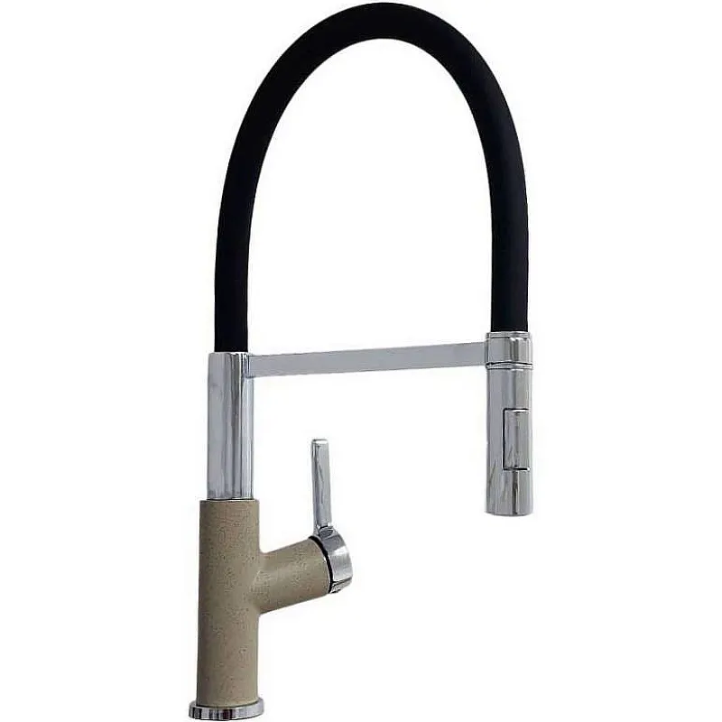 Смеситель для кухни BRNOU BR760-3.Характеристики: Цвет: бежевый, черный. Материал: латунь. Управление: рычажное. Механизм: керамический картридж 40 мм. Излив: поворотный, гибкий, с режимом душ. Аэратор. Стандарт подводки: G 1/2. Тип подводки: гибкая. Монтаж: на мойку, на столешницу. В комплекте поставки: Смеситель. Гибкая подводка.