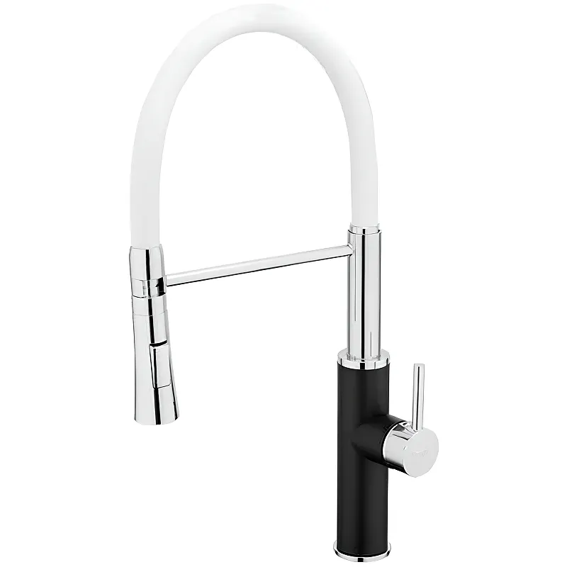 Смеситель для кухни Frap F4452-7 с гибким изливом.Характеристики: Цвет: черный, белый. Материал: латунь. Управление: однорычажное. Поворотный гибкий излив. Монтаж: на мойку, на столешницу. Механизм: керамический картридж. Стандарт подводки: G 1/2. Тип подводки: гибкая подводка. Аэратор. Две функции струи: стандартный водяной поток / душ. В комплекте поставки: Смеситель. Гибкая подводка. Комплект креплений.
