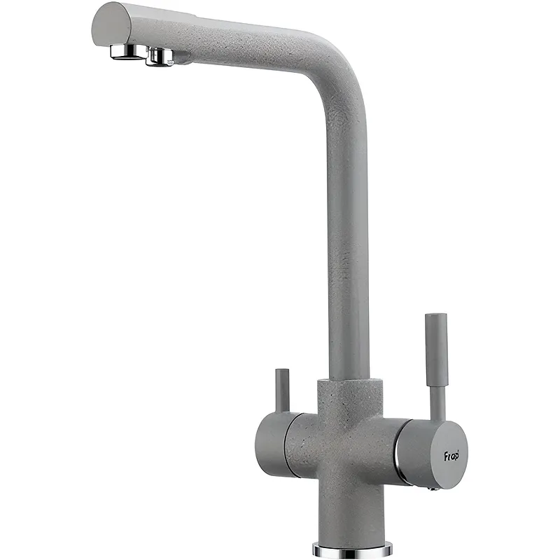 Смеситель для кухни Frap H52 F4352-22 с краном для питьевой воды.Характеристики: Цвет: серый. Материал: латунь. Управление: однорычажное. Излив: поворотный, с каналом для питьевой воды. Монтаж: на мойку, на столешницу. Механизм: керамический картридж. Стандарт подводки: G 1/2. Тип подводки: гибкая. Аэратор. В комплекте поставки: Смеситель. Гибкая подводка. Комплект креплений.