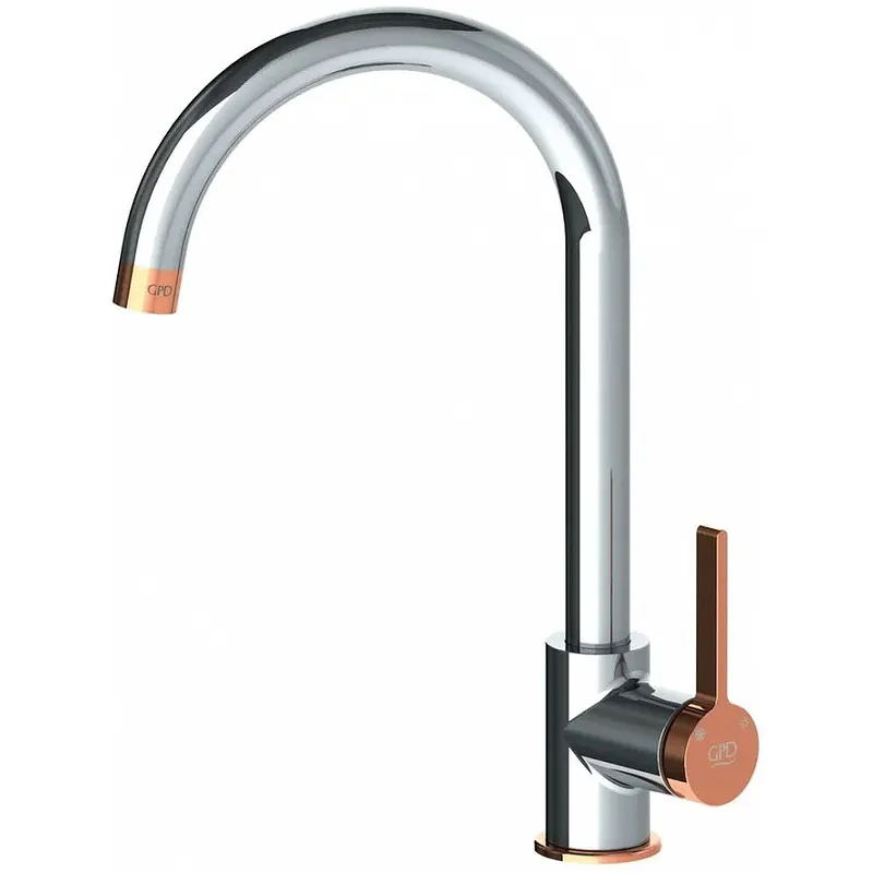 Смеситель для кухни GPD Gildo MTE165-K-R - превосходно дополнит интерьер любой кухни в современном стиле. Цвет: хром, розовое золото. Управление: однорычажное. Изготовлен из высококачественной латуни. Длинный поворотный излив. Керамический картридж. Монтаж: на мойку. В комплекте поставки: смеситель, инструкция.