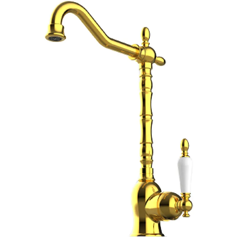 Смеситель для кухни GPD Retro Colored MTE180-A.Характеристики: Цвет: золото. Поверхность: глянцевая. Материал: латунь. Управление: однорычажное. Тип подводки: гибкая. Механизм: керамический картридж. С аэратором. Монтаж: на раковину. В комплект поставки входит: Смеситель. Гибкая подводка. Гарантийный талон. Инструкция по установке и эксплуатации.