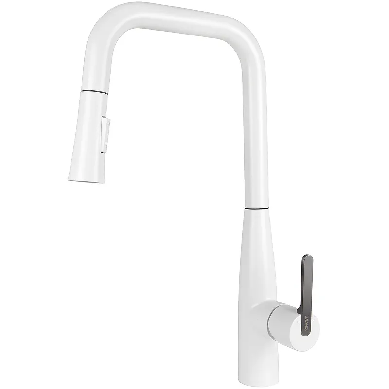 Смеситель для кухни Kaiser Claro 22144-24.Характеристики: Цвет: белый матовый, вороненая сталь. Материал: латунь. Управление: однорычажное. Механизм: керамический картридж 35 мм. Излив: поворотный, выдвижной. Длина шланга: 1700 мм. Стандарт подводки: G 1/2. Тип подводки: гибкая. Тип крепления: гайка. Монтаж: на мойку. В комплект поставки: Смеситель для кухни. Гибкая подводка. Аэратор. Душевой шланг. Шарик для растягивания. Инструкция.