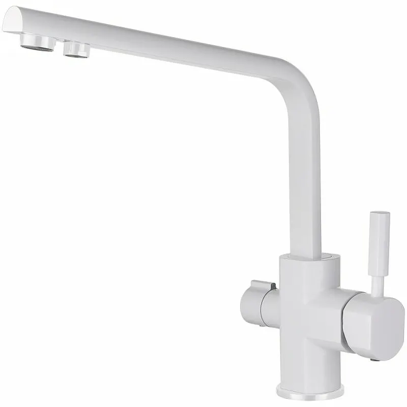 Смеситель для кухни Kaiser Decor 40144-10 с краном для питьевой воды.Характеристики: Цвет: белый глянцевый. Материал: латунь. Управление: однорычажное. Механизм: керамический картридж Sedal 35 мм. Излив: поворотный, с каналом для питьевой воды. Аэратор. Стандарт подводки: 1/2. Тип подводки: гибкая. Монтаж: на мойку / на столешницу. Отверстий для монтажа: 1. Крепление: шпилька одинарная. В комплекте поставки: Смеситель для кухни. Гибкая подводка. Комплект креплений. Инструкция.