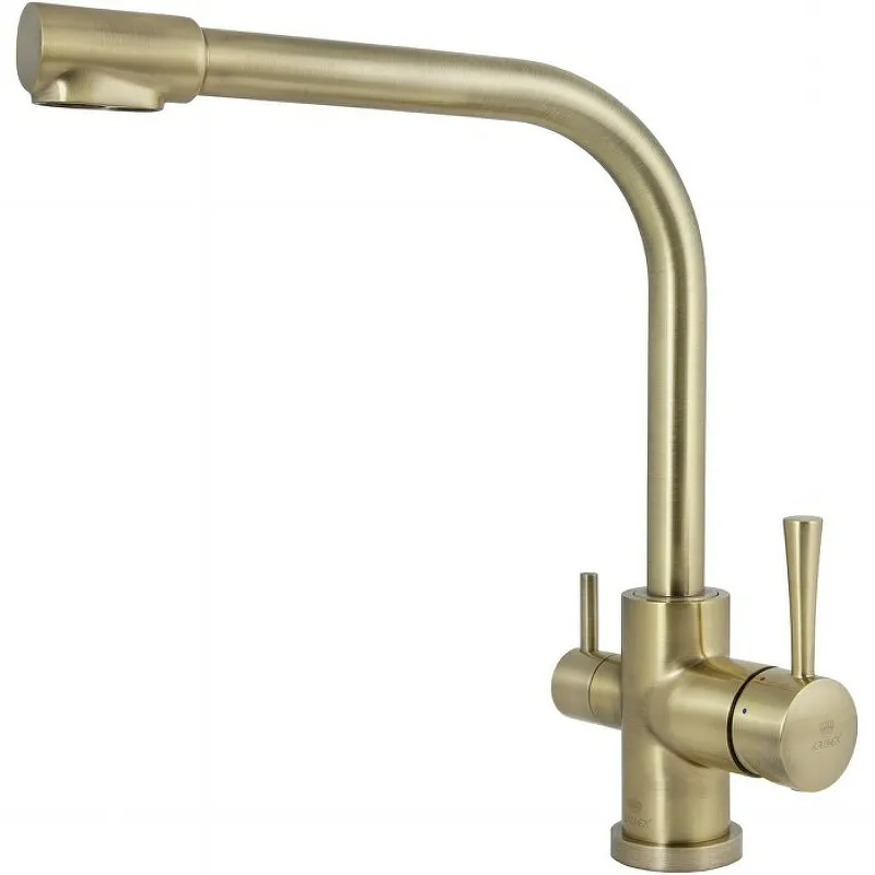Смеситель для кухни Kaiser Merkur 26044-3 с краном для питьевой воды.Характеристики: Цвет: бронза. Материал: латунь. Управление: однорычажное. Механизм: керамический картридж Sedal 35 мм. Излив: поворотный, с каналом для питьевой воды. Аэратор. Стандарт подводки: 1/2. Тип подводки: гибкая. Монтаж: на мойку / на столешницу. Отверстий для монтажа: 1. Тип крепления: латунная гайка. В комплекте поставки: Смеситель для кухни. Гибкая подводка. Комплект креплений.