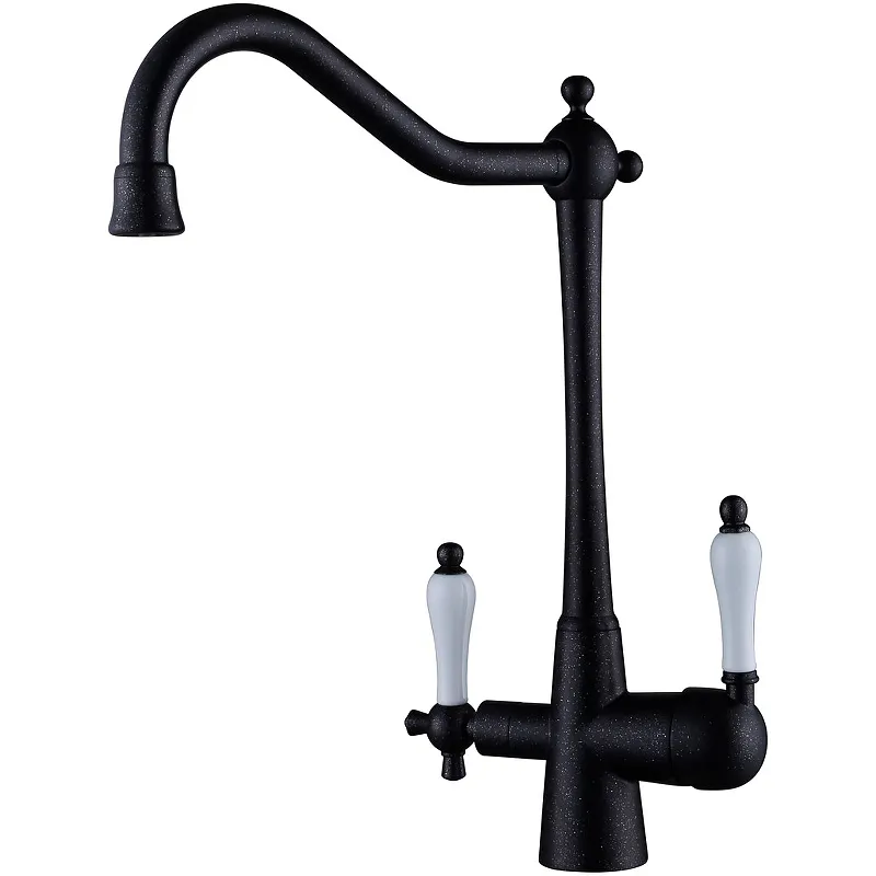 Смеситель для кухни Kaiser Vincent 31844-2 с подключением фильтра для питьевой воды.Характеристики: Цвет: черный мрамор. Материал: латунь. Управление: однорычажное. Механизм: керамический картридж 35 мм. Излив: поворотный, с каналом для питьевой воды. Стандарт подводки: G1/2. Тип подводки: гибкая. Монтаж: на мойку. В комплект поставки: Смеситель для кухни. Гибкая подводка. Аэратор. Инструкция.
