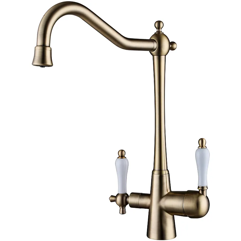 Смеситель для кухни Kaiser Vincent 31844-3 с подключением фильтра для питьевой воды.Характеристики: Цвет: бронза. Материал: латунь. Управление: однорычажное. Механизм: керамический картридж 35 мм. Излив: поворотный, с каналом для питьевой воды. Стандарт подводки: G1/2. Тип подводки: гибкая. Монтаж: на мойку. В комплект поставки: Смеситель для кухни. Гибкая подводка. Аэратор. Инструкция.