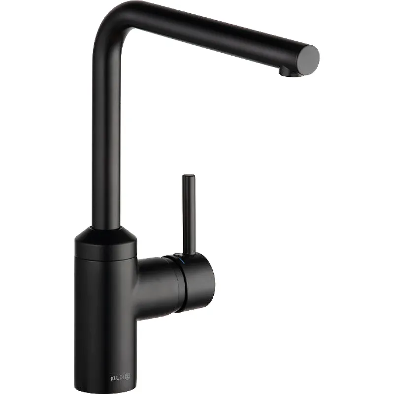 Смеситель для кухни Kludi L-ine 428143977.Характеристики: Цвет: черный матовый. Материал: латунь. Управление: однорычажное. Механизм: керамический картридж с ограничением подачи горячей воды. Излив: поворотный 360 градусов. Стандарт подводки: G 3/8. Тип подводки: гибкая. Аэратор М16.5х1. Расход воды: 7.6 л/мин при давлении 3 бара. Eco-функция - экономия не менее 40 процентов воды. Уровень шума I. Система быстрого монтажа. Монтаж: на мойку. В комплекте поставки: Смеситель для кухни. Гибкая подводка. Аэратор. Комплект креплений.