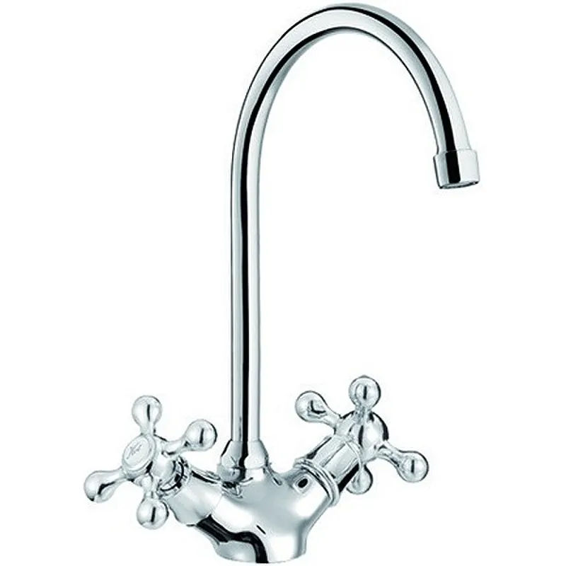 Двухвентильный смеситель для кухни Orange Alfi M11-003cr.Характеристики: Цвет: хром. Материал: латунь. Механизм: керамическая кран-букса. Управление: вентильное. Излив: поворотный. Стандарт подключения: G1/2. Монтаж: на мойку. В комплекте поставки: Смеситель. Набор креплений. Гибкая подводка.