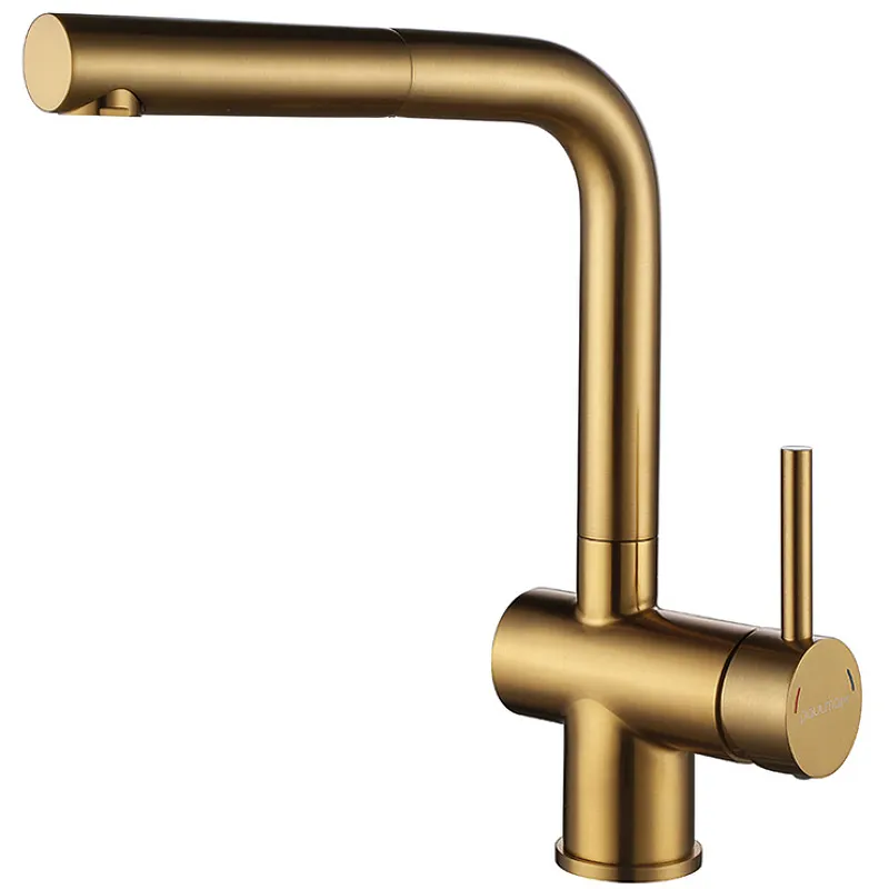 - **Эстетичный дизайн**: Брашированное золото и современный стиль делают смеситель привлекательным элементом вашей кухни.