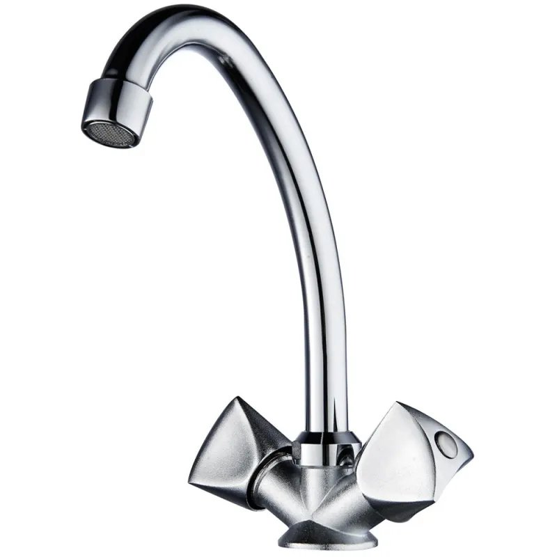 Смеситель для кухни Ростовская Мануфактура Сантехники SL119-271.Характеристики: Цвет: хром. Материал: цинковый сплав. Управление: двухвентильное. Излив: высокий поворотный. Механизм работы: кран-букса латунная с керамическими пластинами, угол поворота 180 градусов. Крепление: шпилька. Аэратор: пластиковый. Монтаж: на мойку. В комплекте поставки: Смеситель. Гибкая подводка.