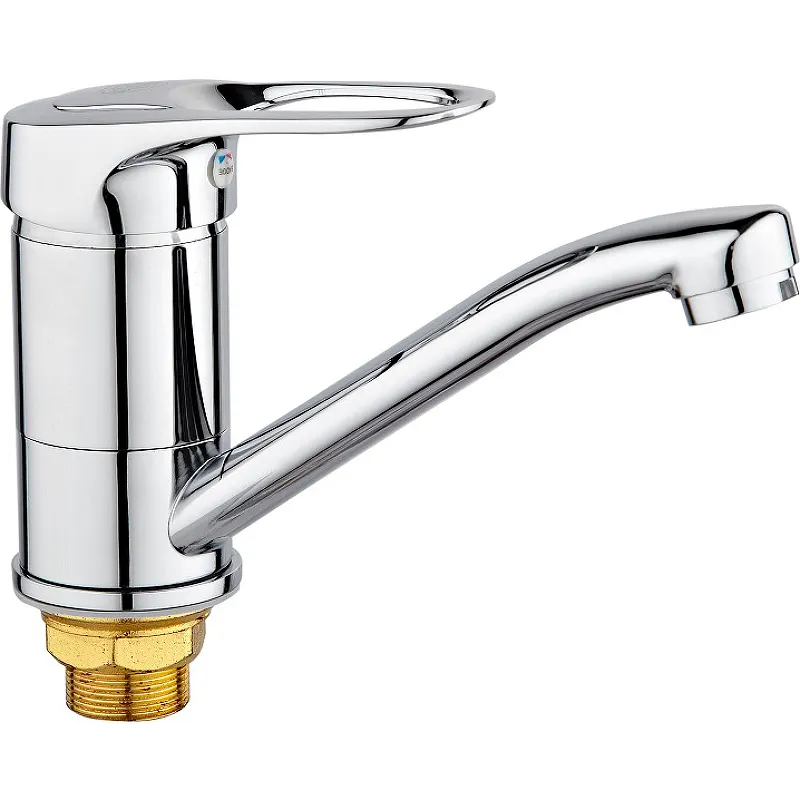 Смеситель для кухни Ростовская Мануфактура Сантехники SL55-004F-15.Характеристики: Цвет: хром. Материал: цинковый сплав. Управление: однорычажное. Излив: поворотный. Механизм работы: керамический картридж, 40 мм. Крепление: гайка. Аэратор: пластиковый. Монтаж: на мойку. В комплекте поставки: Смеситель. Гибкая подводка.