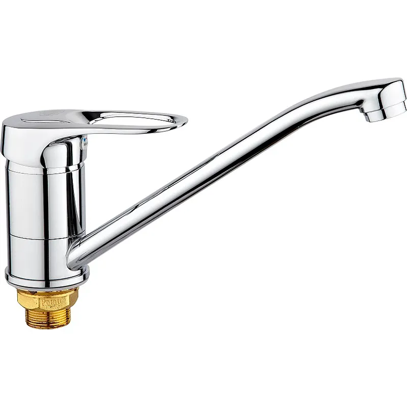 Смеситель для кухни Ростовская Мануфактура Сантехники SL55-004F-25.Характеристики: Цвет: хром. Материал: цинковый сплав. Управление: однорычажное. Излив: длинный поворотный. Механизм работы: керамический картридж, 40 мм. Крепление: гайка. Аэратор: пластиковый. Монтаж: на мойку. В комплекте поставки: Смеситель. Гибкая подводка.